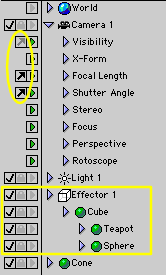 First, what is that arrow flag thing (yellow circle) in the project window? What is it used for? Can you give me an example? Nothing in the manual. Second, I would like to hide (in the world view) the Cube, Teapot and the Sphere in one click without hiding the Cone. In other software I would hide the Effector and all it's children would become invisible. Finally, if the children of a hierarchy are hidden in the project window, can you hide the hierarchy and all it's children in the world view with one click? Found a way, but it is tedious. Let say that the Effector 1 has it's children hidden, but it does not really matter. 1-Select the Effector 1 2-Right click Select/Offspring 3-Hold Shift Key, then reselect Effector 1 4-Hold Command Key the click the Visibility checkbox of the Effector 1