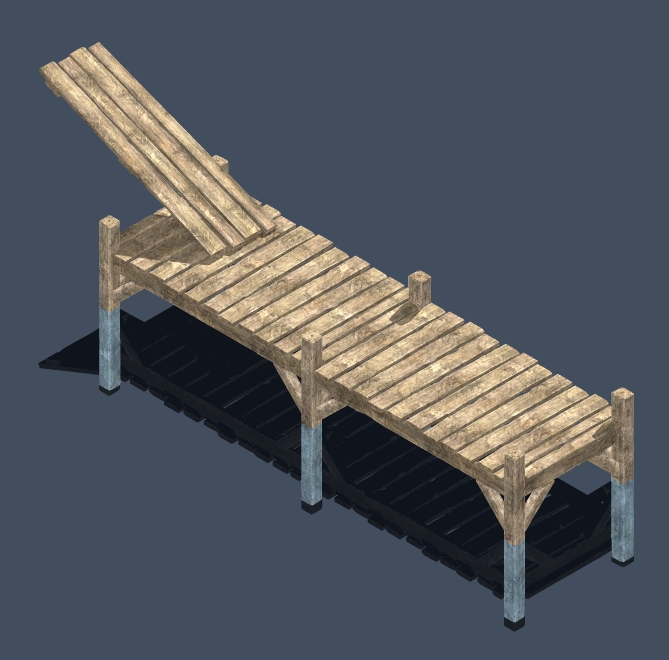 Or does eias support multiple vertices uv per model? If yes, how? I would like to use the model uv space to texture (bitmap) a wood plank. Then I would like to add a dirt bitmap above but this time using the spherical mapping method. I am making a deck made of multiple wood planks inside a single model. Each plank has it's own uv. So the wood bitmap is applied to the object uv. Then I would like to apply a color variation bitmap and dust bitmap to the model by using the cubic mapping or planar instead of the object uv. This is my technique to weather models, so there is a continuity to filth/dirt from one plank to the other. I could use only the EIAS mapping method instead of UV but I have much more complex model to weather later and it won't work. This is the model rendered in Strata that I need to bring into EIAS